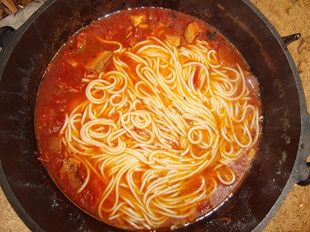 昨日の残りにトマト缶 ベーコンを入れて スープスパ