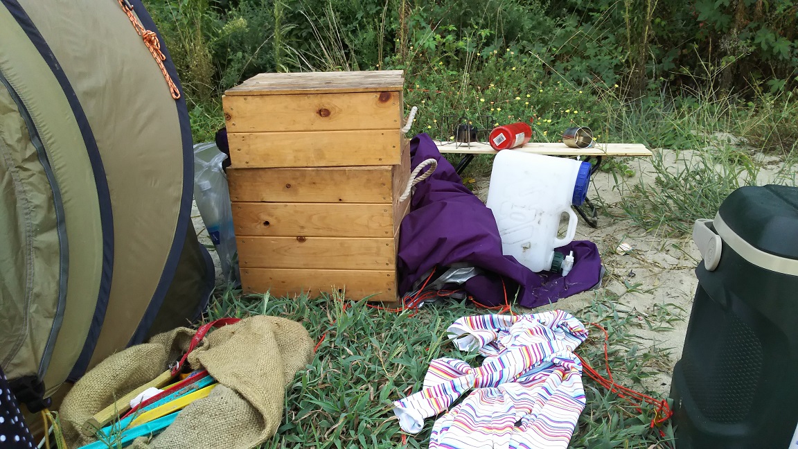 とりあえずタープをくるくる~として 後ろに置き~ 飛ばされないように荷物のっけて~