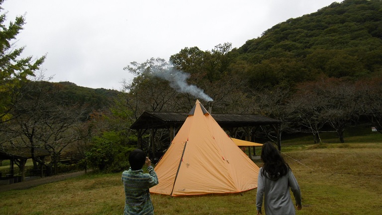 ティピの真ん中にストーブを置いて そこから煙突を出せるのです♡