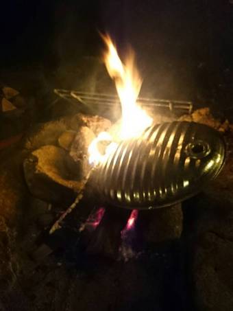 焚き火の中に入れて温める湯たんぽに魅せられて